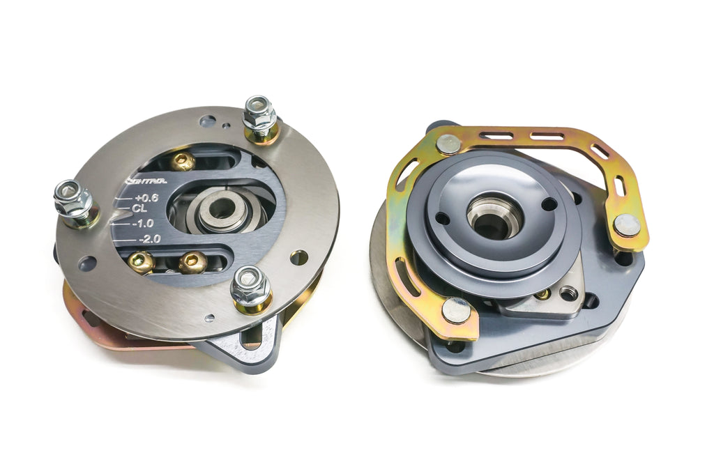 The Ground Control camber plates feature two sets of bearings, a proprietary bearing, made to our specs by Aurora in the USA, which allows for articulation of the shock shaft. This spherical bearing is very understressed, as the Ground Control design does NOT support the weight of the car on the spherical bearing. Instead, the weight of the car is supported by a completely separate articulating needle bearing, which is also manufactured for Ground Control in the USA.