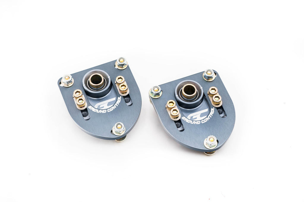 Bolt-in, no drilling, camber and caster adjustable upper mounts for the early MR-2.