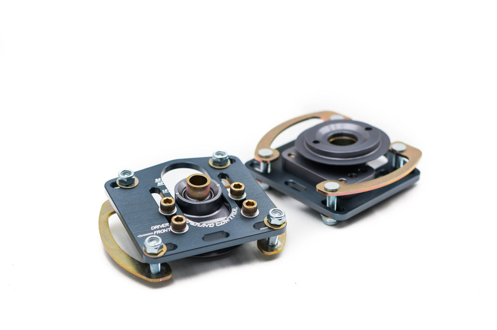The Ground Control camber plates feature two sets of bearings, a proprietary bearing, made to our specs by Aurora in the USA, which allows for articulation of the shock shaft. This spherical bearing is very understressed, as the Ground Control design does NOT support the weight of the car on the spherical bearing. Instead, the weight of the car is supported by a completely separate articulating needle bearing, which is also manufactured for Ground Control in the USA