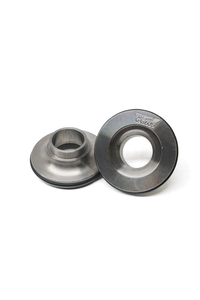 These stainless steel "TeePee" adapters are specifically made to slot into the bottom of the spherical bearing of your Ground Control race camber or camber/caster plates.