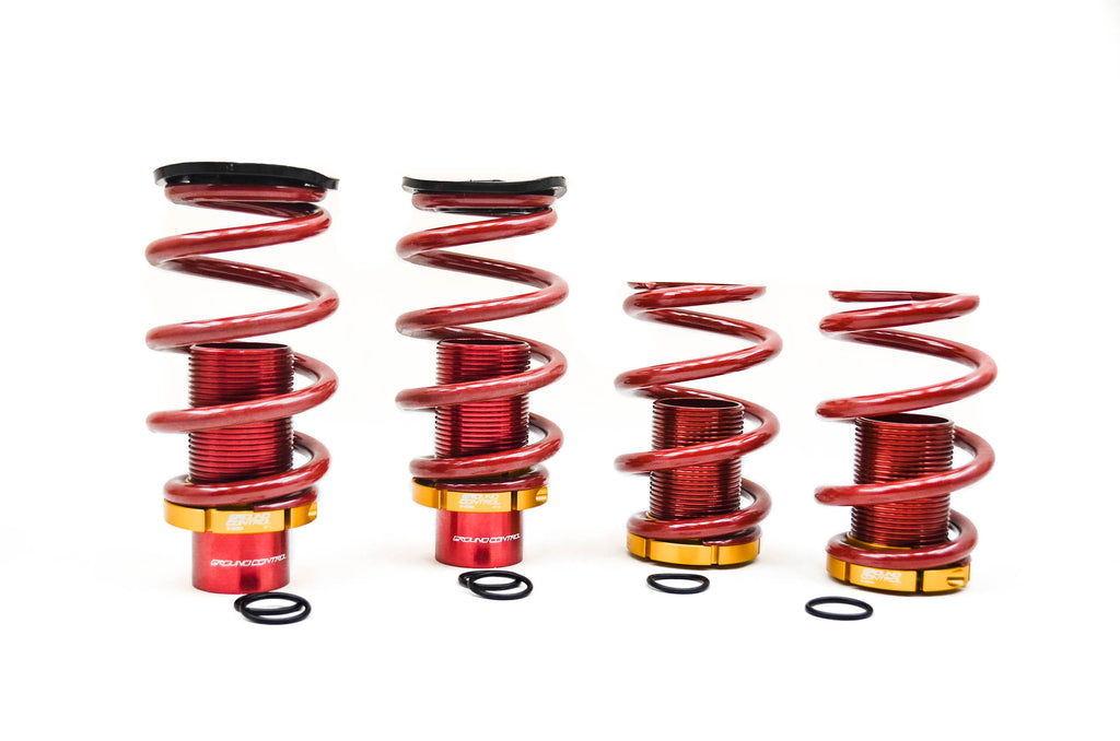 This spring kit gives you the option to customize the ride height of your vehicle. After several years of use in racing applications, Ground Control spring kits have been adapted for street use. Most other spring kits offer only one set ride height when installed. The Ground Control system's unique design allows for easy adjustment. Simply lift the corner(s) of the vehicle that you wish to adjust and spin the adjustable spring seat up or down to raise or lower the vehicle*. Ground Control spring kits are also designed to be used with either stock or aftermarket shocks.